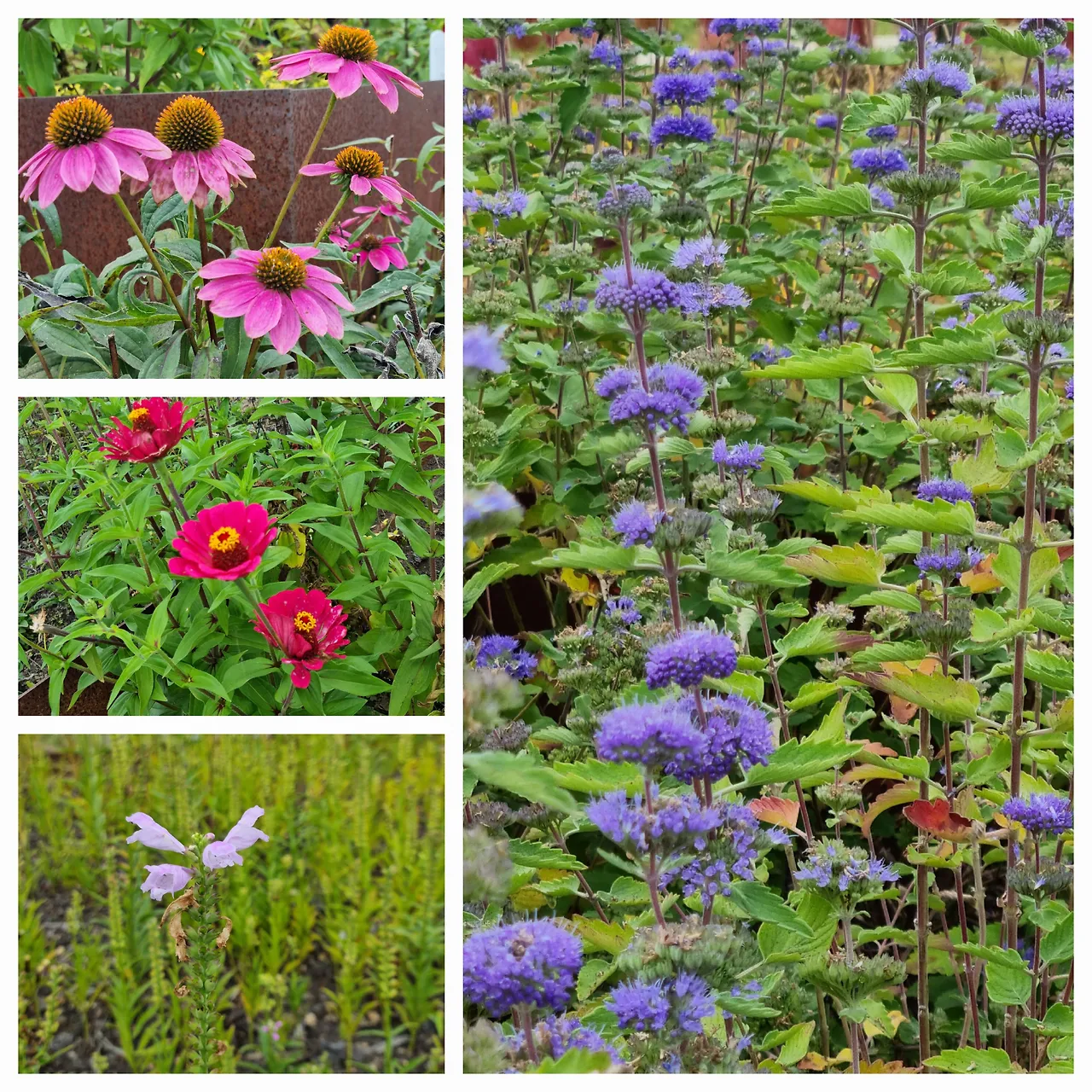 에키나세아 꽃들과 이름도 귀여운 꽃범의 꼬리(좌아래), 층층이 핀 층꽃나무(우)