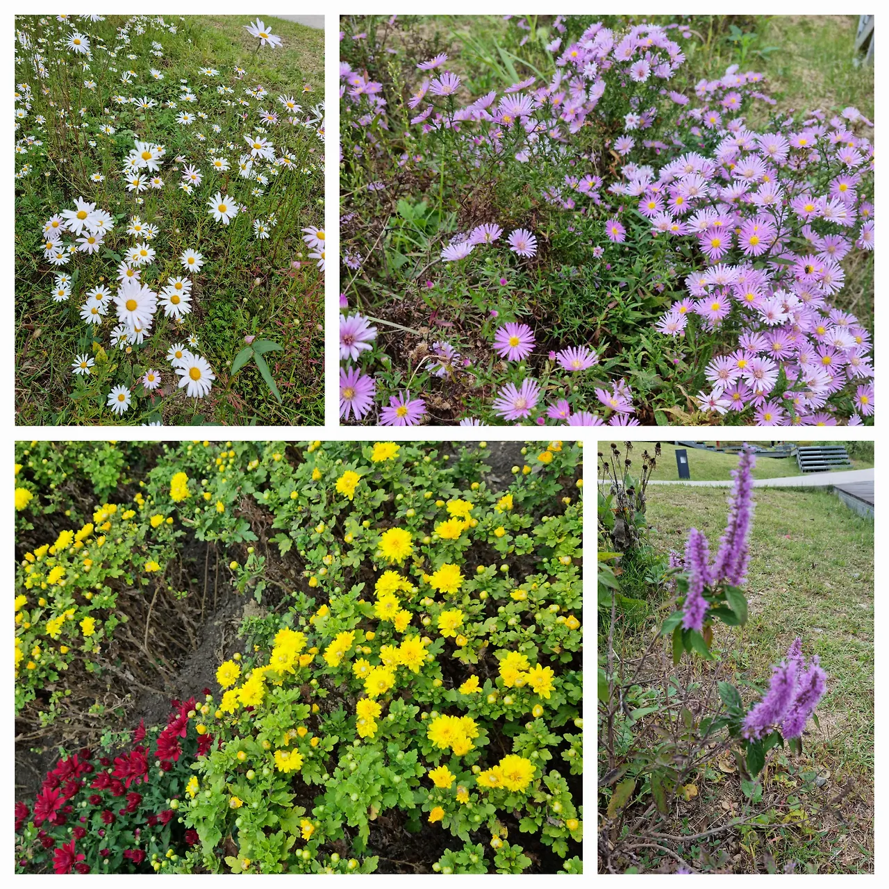 하얀 구절초와 가을에 어울리는 산국화들과 이름도 특이한 보라색 꽃향유.