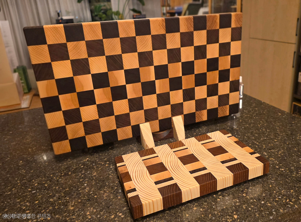 두가지 색상의 나무로 꽉꽉 짜 맞춘 도마였다.