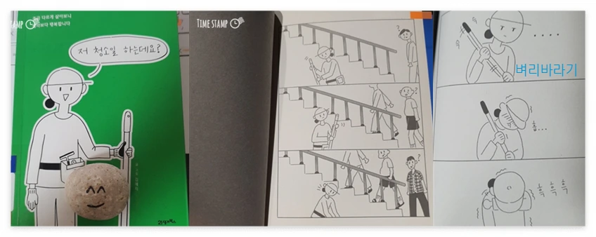 이 책의 작가는 26살에 어머니의 권유에 따라 어머니와 함께 청소일을 하게 되었다. 건물 계단이나, 사무실 등을 청소하는 일이었다. 하지만 작가는 그렇게 일을 하면서도 스스로의 직업을 말하는데 오랜 시간이 걸렸다. 명함도 없을뿐더러 사람들에게 선뜻 청소 일을 한다 말하지 못하는 것. 그건 작가 스스로도, 그리고 청소 일은 왠지 나이가 지긋이 드신 분이 직업으로 선택할 것이라는 사회적 편견에서도 자유롭지 못한 일이었기 때문이었다. 작가에게 ‘무슨 일 하세요?’라고 물어본 사람들이 작가의 대답을 듣고 ‘신기한 일을 하네요’라고 이야기하는 것. 그게 아직 우리 사회의 시선인 것이다.