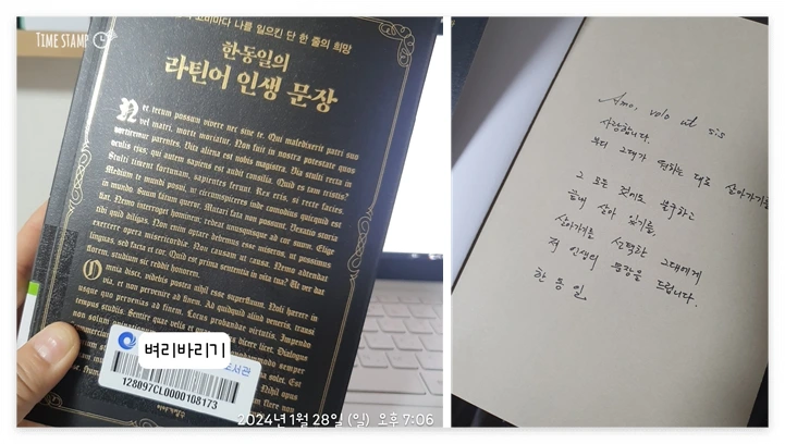 살아가면서 마음에 오래 남아 일상의 순간순간 힘이 되어 주는 문장들이 있다. 이번 책은 그런 느낌으로 읽은 책이다. 한동일 교수님의 ‘라틴어 수업’을 읽은 적이 있었다. 라틴어에 대한 관심이 전혀 없지만, ‘인생 문장’이라는 구절에 집중하여 작가의 삶 가운데 힘이 되어 준 문장은 무엇인지, 또는 내가 그런 문장을 발견할 수 있는지 궁금함을 가지고 시작한 책이다. 여행지에 함께 가지고 갈 만큼 가벼우면서도 읽기 쉬운 책이면서, 몇몇 구절은 괜스레 라틴어 문장을 외우고 싶다는 생각이 들기도 했다.
