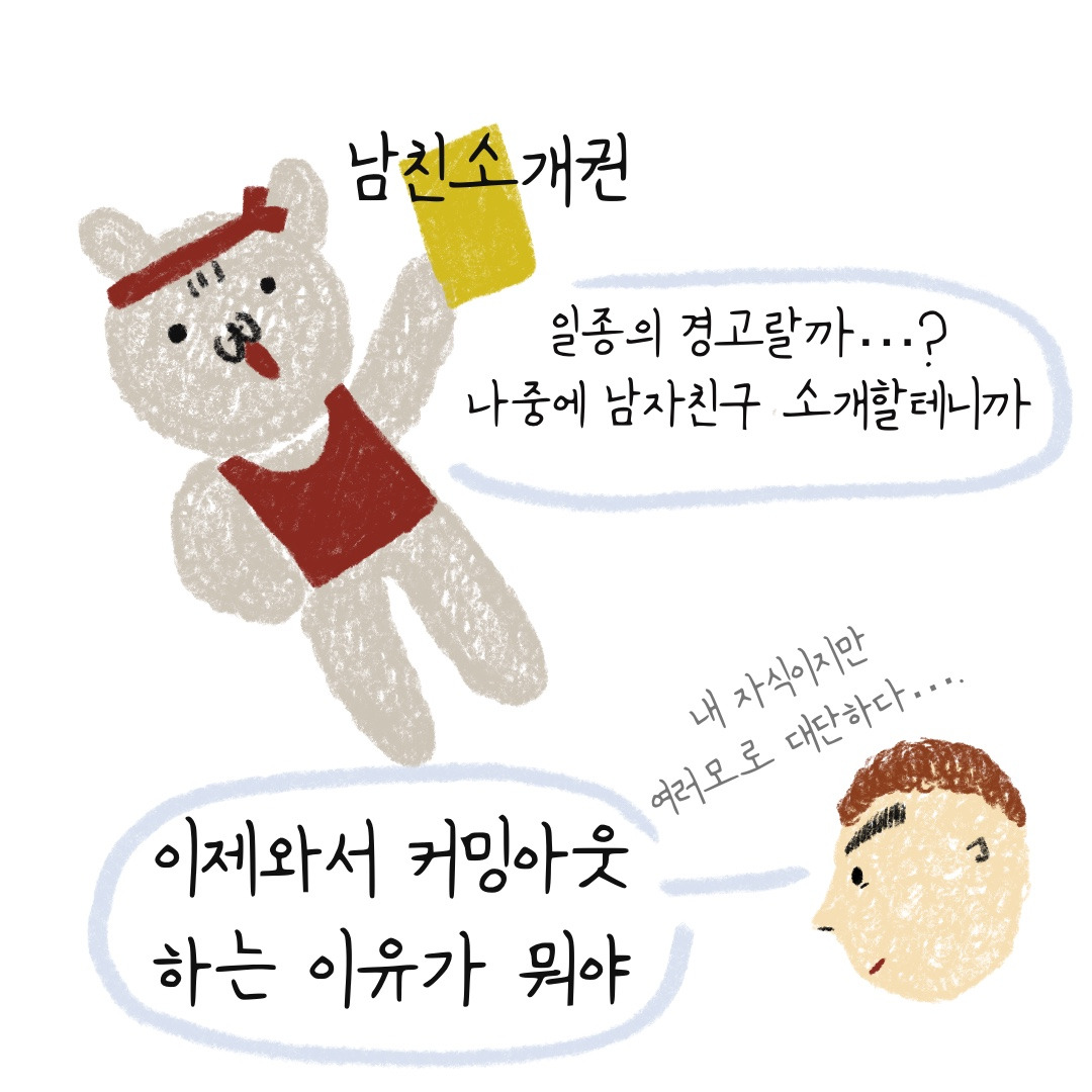 - 5년 차 때, 상견례자리에서 커밍아웃하기엔 부모님이 당황하실 수 있잖아! 그니까 3년 차에 커밍아웃해 놓자는 거야. 기반을 다져 놓는 거랄까?