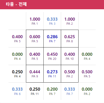 그에 비해 이번 시즌에는 바깥쪽 공에 대한 대처는 늘었지만 몸쪽 공에 대한 장타가 부족한 상황입니다.