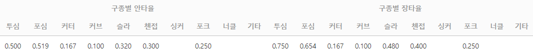 [24년 5월 7일 기준 구종별 안타율과 장타율 (출처: STATIZ)]