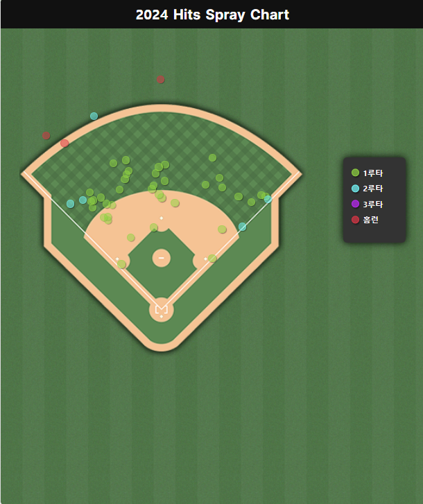 타구 분석을 위해 STATIZ 외에도 2itracking과 fangraphs 등을 참고했으나 타구 메트릭스는 기관마다 차이가 크게 나타났고 평균 타구 속도, 하드힛% 등에서는 공통적으로 특출난 기록을 보이지 않았습니다. 다만 fangraphs 기준으로 미디엄힛%가 59.4%를 기록하며 60%에 육박하는 점은 돋보였습니다.