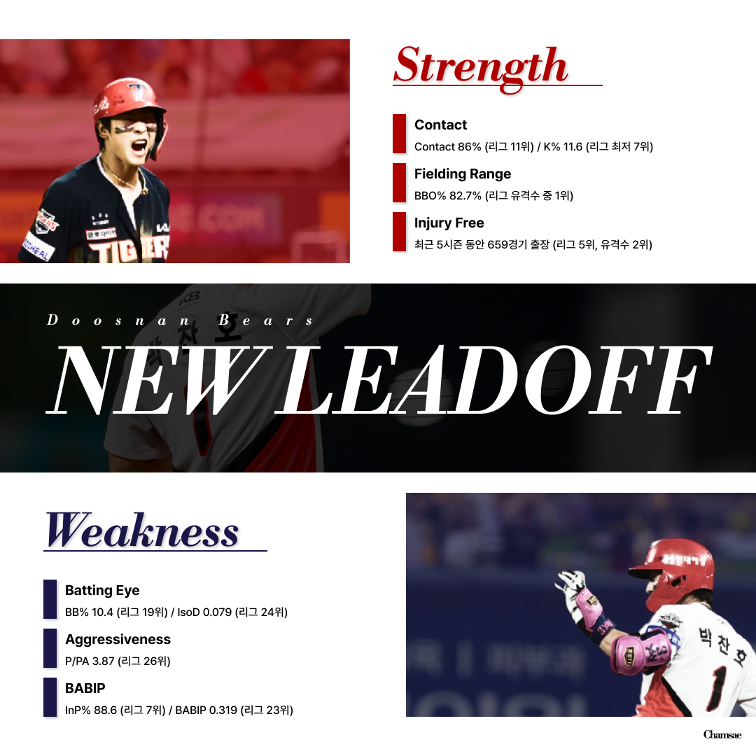 박찬호 선수는 준수한 컨택 능력을 바탕으로 공을 치고 나가려는 성향이 강합니다. 이는 규정타석을 소화한 리그 43명의 선수 중 11위를 기록한 Contact%, 리그 최저 7위를 기록한 K%에서 알 수 있습니다. 여기에 최근 5시즌 동안 659경기를 출장한 철강왕이라는 점은 안정적인 타순을 구상하기에 적합한 면모입니다.