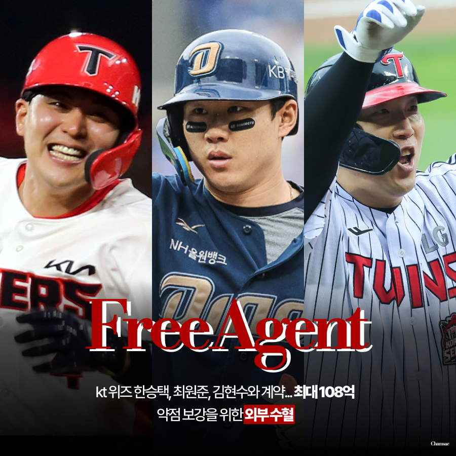 kt 위즈는 11월 20일 한승택과 4년 10억(계약금 2억, 연봉총액 6억, 옵션 2억)에 계약했음을 발표했습니다. 이어 25일 3년 50억에 김현수(계약금 30억, 연봉총액 20억)와 4년 48억에 최원준(계약금 22억, 연봉총액 20억, 옵션 6억)을 영입하며 3명의 야수진에 108억을 지불했습니다. 강백호를 떠나보낸 대신 3명의 야수를 데려오며 야수진의 뎁스를 강화한 kt 위즈입니다. 약점을 최소화하기 위한 kt 위즈의 노력이 과연 빛을 발할 수 있을지 지켜볼만한 대목입니다.