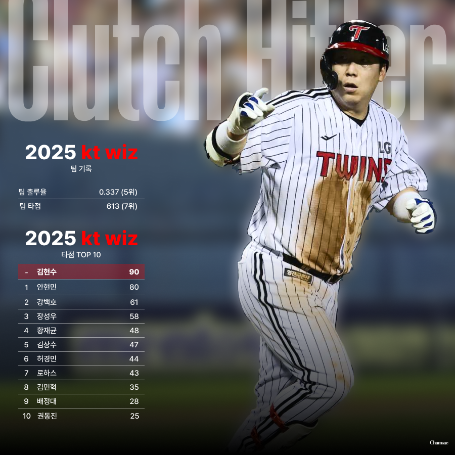 2025시즌 kt 위즈의 타격은 팀의 발목을 붙잡았습니다. 팀타율 9위, 팀홈런 공동 7위, 팀OPS 공동 8위 등 타격 지표에서 하위권을 맴돌며 팀의 가을야구 진출에 장애물이 되었습니다. 그럼에도 불구하고 팀출루율 5위로 나름 누상에 착실히 주자를 내보낸 kt 위즈였지만 결국 팀타점 613점으로 7위를 기록하며 해결사의 부재를 뼈아프게 느껴야 했습니다. 그런 측면에서 새롭게 합류한 김현수에게 팀의 새로운 해결사 역할을 기대해야 합니다. 2025시즌 kt 위즈에서 50타점 이상을 기록한 선수는 3명뿐이었습니다. 그리고 강백호의 이적으로 타선의 구멍이 늘어난 kt 위즈는 중심타선에서 활약할 선수가 절실히 필요했을 것입니다.
