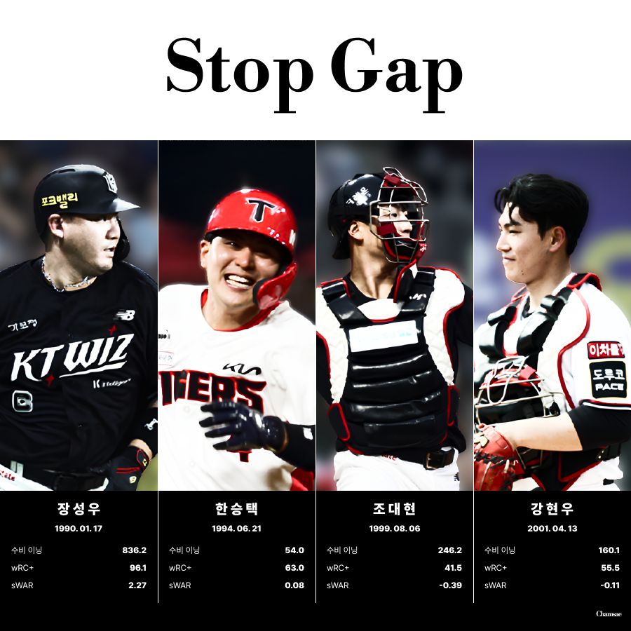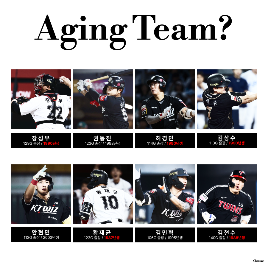 하지만 김현수의 영입은 kt 위즈의 가장 큰 걱정거리를 해결해주진 못했습니다. 바로 야수진의 나이입니다. 지난 시즌 kt 위즈에서 100경기 이상 소화한 선수 7명 중 4명이 35세 이상의 선수였습니다. 더불어 부상으로 출장 경기 수는 적었지만 팀의 주전 멤버였던 강백호마저 떠나며 신인왕 안현민의 부담은 커져만 가고 있습니다.