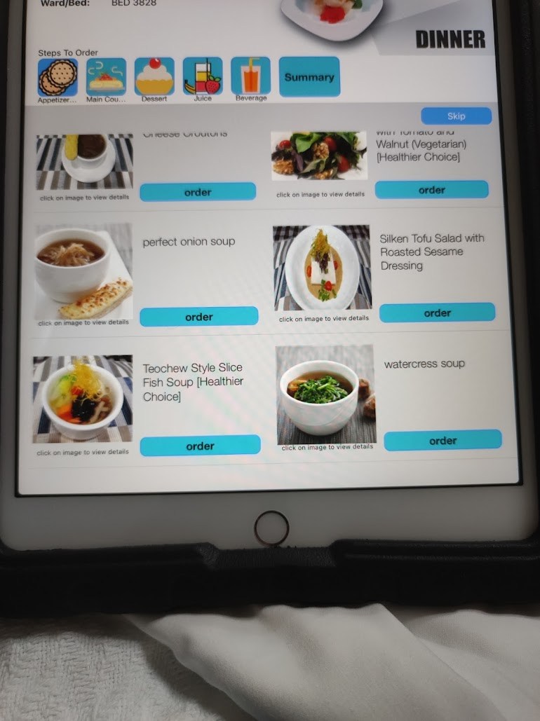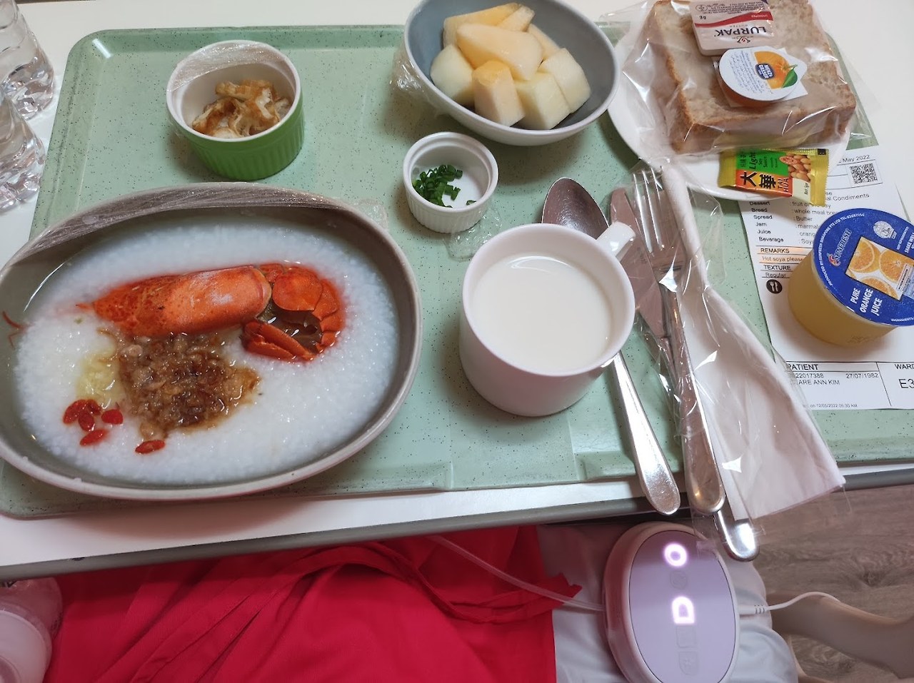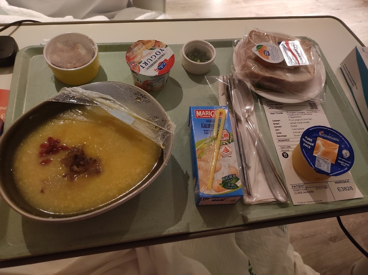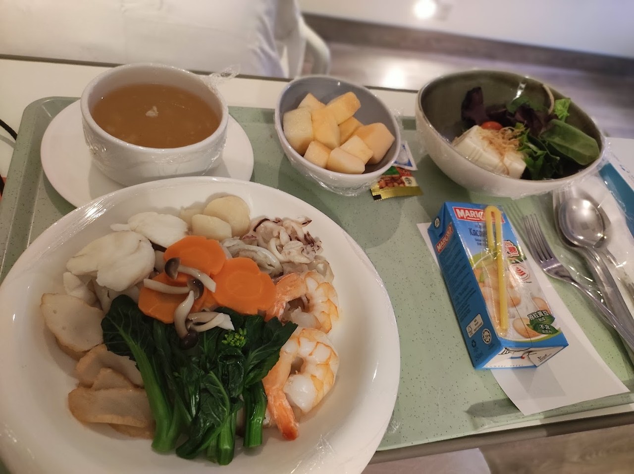 그리고 병원식이 국립병원 때보다 선택의 종류도 많고 맛이 있었는데요. 국립병원에서는 '중국식, 서양식, 말레이식' 이런 식으로 크게 종류만 선택할 수 있었는데요. 반면 사립병원에서는 애피타이저, 메인 메뉴, 후식, 음료수 등 코스를 모두 선택할 수 있게 되어 있었습니다.