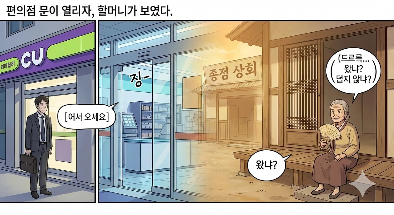 어느 늦은 오후, 나는 홀린 듯 다시 장수동을 찾았다. '종점 상회'가 있던 자리는 편의점으로 바뀌어 있었고, 우리가 뒹굴던 갯벌 근처에는 거대한 공원이 들어서 있었다. "오라이!"를 외치던 안내양 누나도, 하얀 모시옷을 입고 활을 쏘던 할아버지도, 붉은 루즈를 바른 우리 할머니도 이제는 그곳에 없었다.