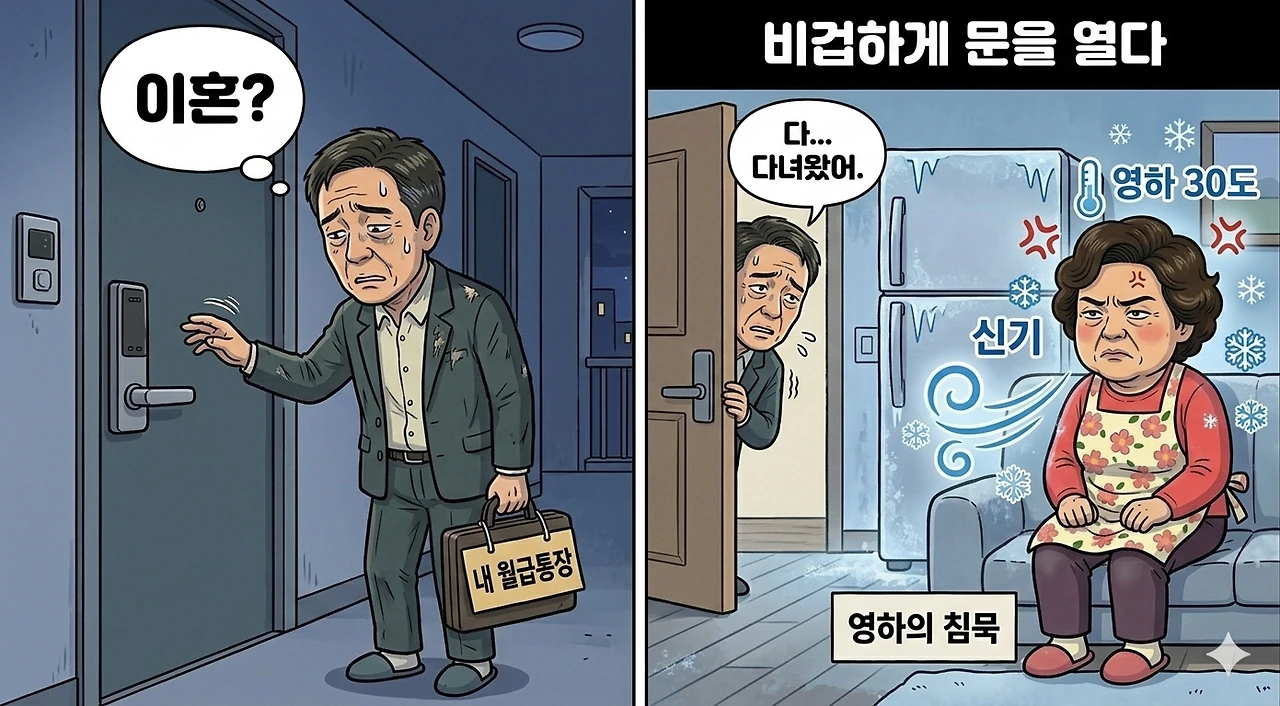 그는 사랑해서가 아니라, 잃는 게 무서워서 비겁하게 문을 열었다. "다녀왔어." 대답 없는 거실을 향한 그 인사는, 살려달라는 구조 신호였다.