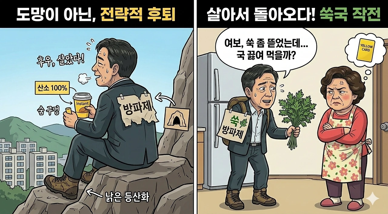 그렇게 에너지를 채워 내려오면, 신기하게도 아내에게 다시 말을 걸 용기가 생겼다. "여보, 내려오다 쑥 뜯었는데 국 끓여 먹을까?" 나만의 동굴이 있었기에, 다시 전장으로 복귀할 수 있었다. 도망치는 게 아니라, 살아서 돌아오기 위한 전략적 후퇴였다.