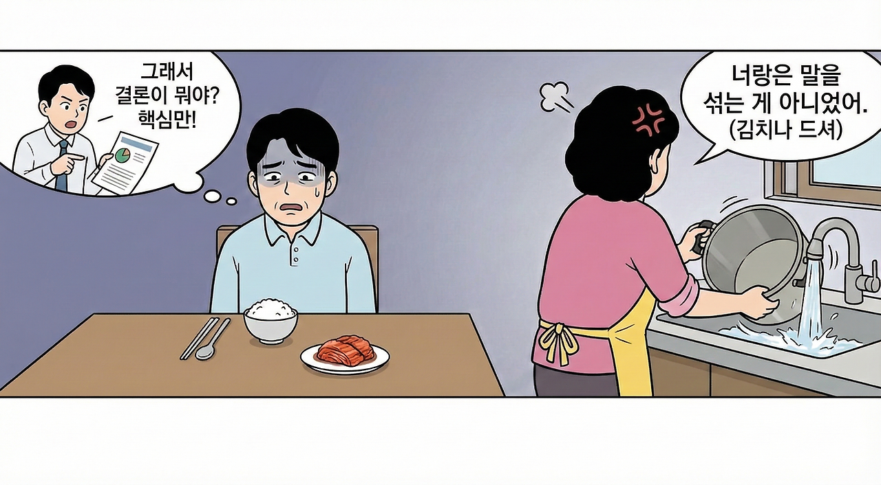"그래. 너는 회사에서야 '결론만 말해'가 통하겠지. 근데 집에서도 그러면... 나는 뭐야? 너한테 서론, 본론도 없이 결론만 보고하는 부하직원이냐?"