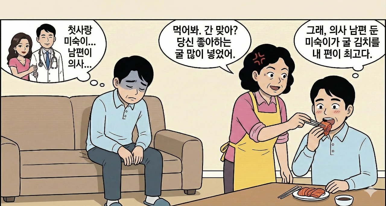 그때 정 여사가 갓 버무린 김치 한 쪽을 손으로 찢어 나경제 입에 쑥 넣어줬다. "어때 괜찮아? 당신 좋아하는 굴 많이 넣었는데..."
