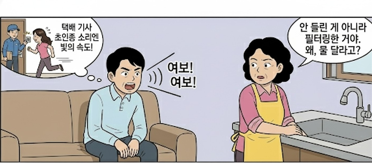 거실에서 “여보! 여보!! 물 좀!!” 하고 음량을 최대로 높여도 정 여사는 꿈쩍도 않는다.