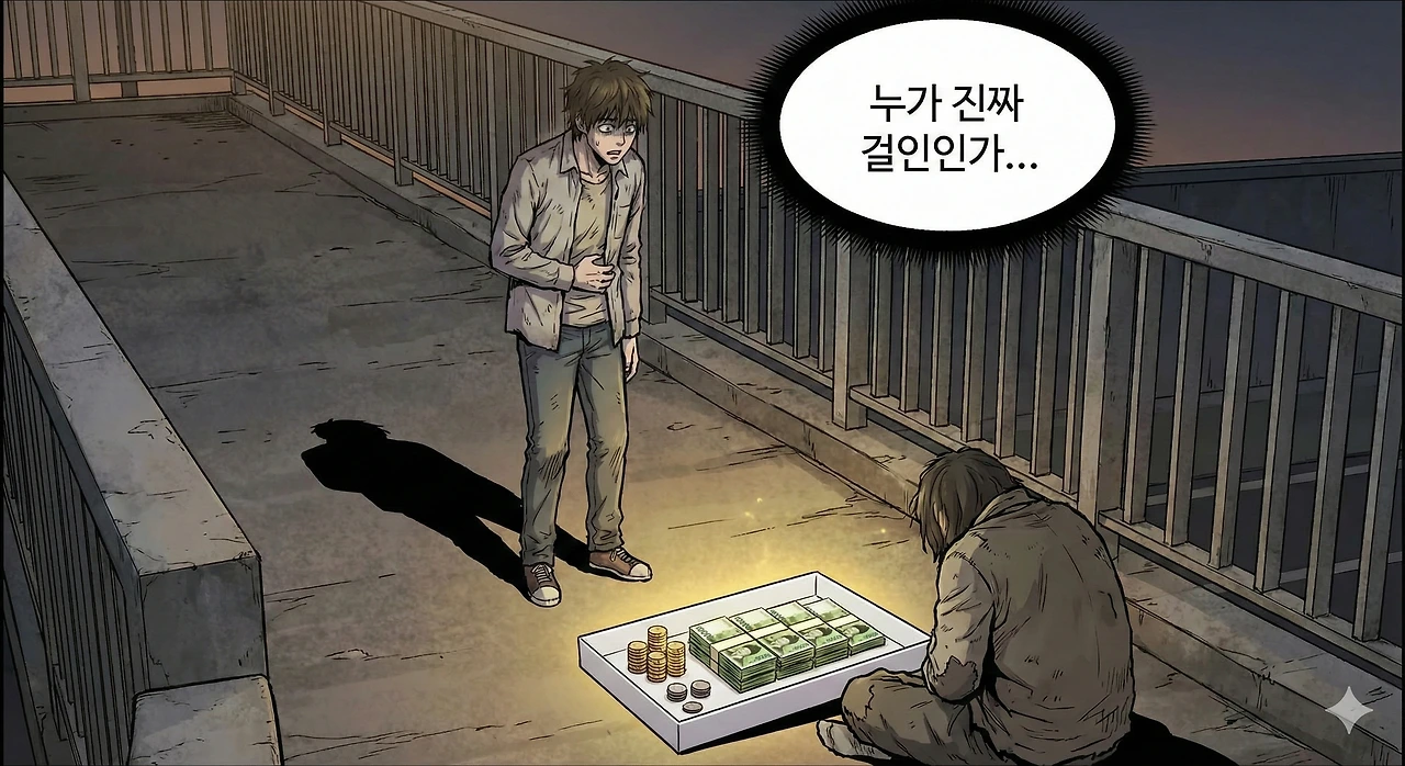 형식적으로는 바닥에 앉아 손을 벌리는 그가 걸인이었다. 하지만 실질적인 자본의 크기로 보자면, 당장 밥 한 끼 사 먹을 돈이 없어 비틀거리는 내가 진짜 걸인이었다. 그는 '가난'을 연기하며 부를 축적하고 있었고, 나는 '평범'을 연기하며 빈곤에 허덕이고 있었다.