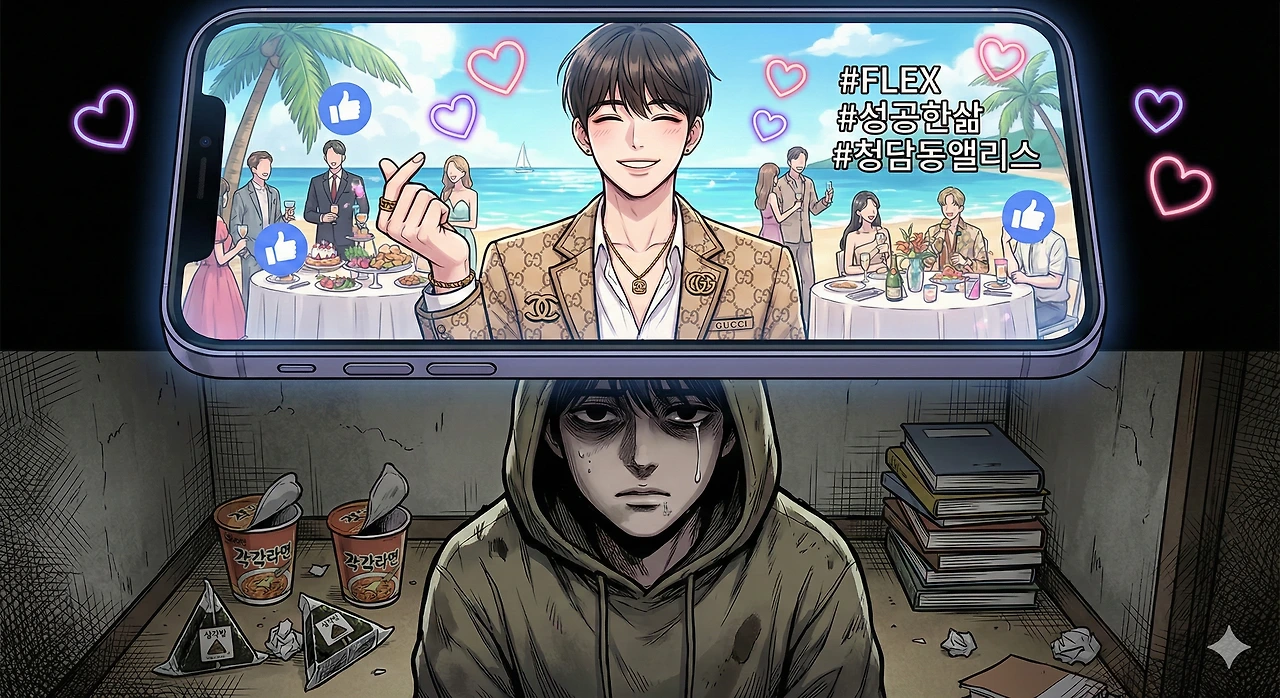 그들은 자신의 인생에서 가장 빛나는 0.1초의 찰나만을 편집해서 전시한다. 구질구질한 출근길, 상사의 고함 소리, 카드값 독촉 문자는 프레임 밖으로 정교하게 잘라낸다. 그곳에는 오직 '성공한 나', '여유로운 나'라는 가짜 자아만이 존재한다.