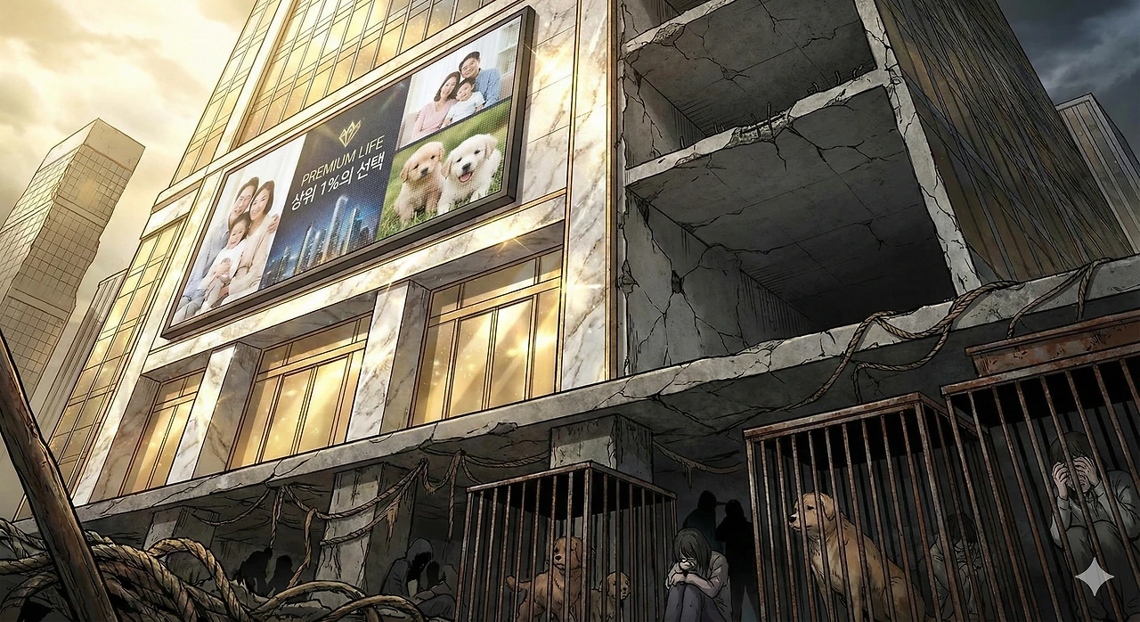 펫숍 쇼윈도 안의 강아지가 300만 원짜리 명품으로 대접받으며 꼬리를 흔들 때, 그 어미는 뜬 장 안에서 썩은 사료를 씹으며 소리 없는 비명을 지른다.