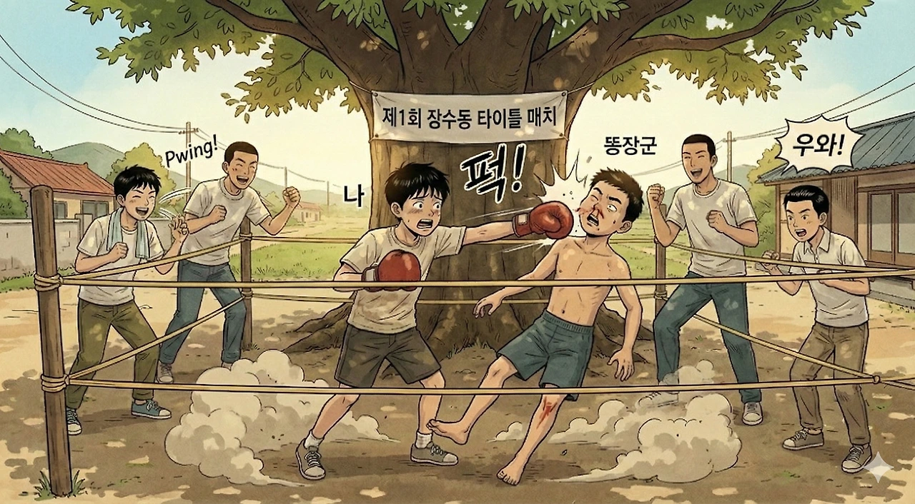 그렇게 '제1회 장수동 타이틀 매치'가 성사되었다. 경기장은 느티나무 아래 공터. 링 줄은 뺀질이 형이 가져온 노란 고무줄 몇 개를 나무와 전봇대에 대충 묶은 게 다였다.