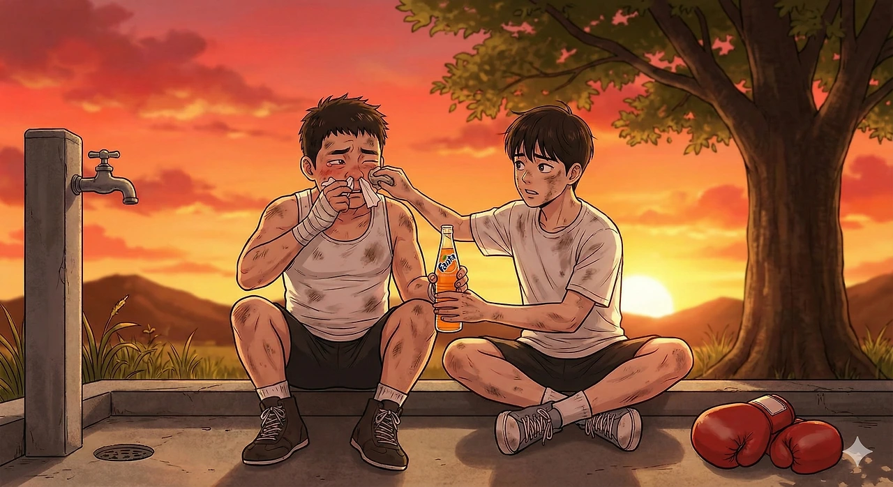 그때 왕눈이 형이 다가와 우리 어깨에 손을 올렸다. "잘 싸웠다, 짜식들. 자, 파이트머니 받아라." 형이 내민 건 미지근해진 '환타' 한 병이었다.