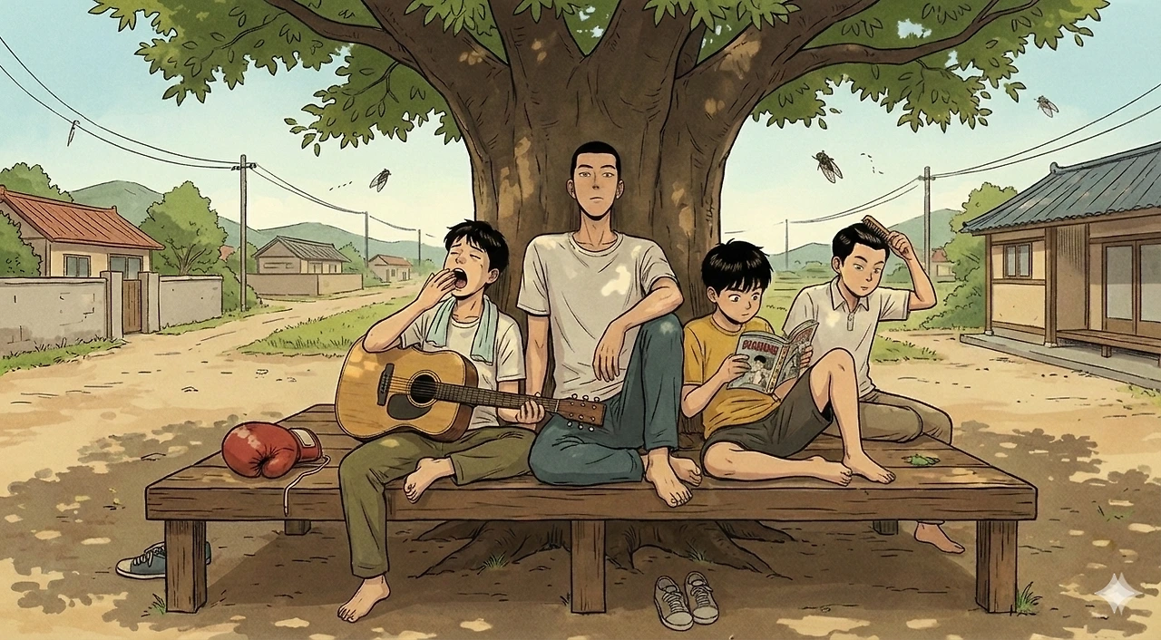 장수동의 오후는 무료했다. 매미 소리마저 지쳐서 끊어질 즈음, 종점 상회 옆 느티나무 아래에는 어김없이 그들이 있었다. 장수동의 잉여 인력, 일명 '동네 형들 4인방'.