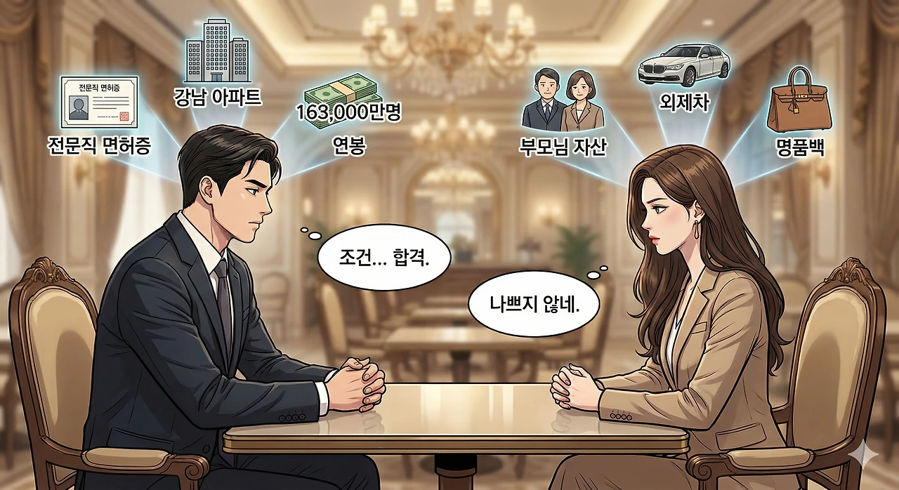 ​남자는 전문직 면허증을 테이블 위에 보이지 않게 올려두었고, 여자는 강남에 있는 부모님 소유의 등기부등본을 은연중에 내비쳤다. 그들의 눈빛은 연인을 바라보는 설렘이 아니라, 인수합병(M&A) 계약서의 독소 조항을 검토하는 투자자의 눈빛이다.
