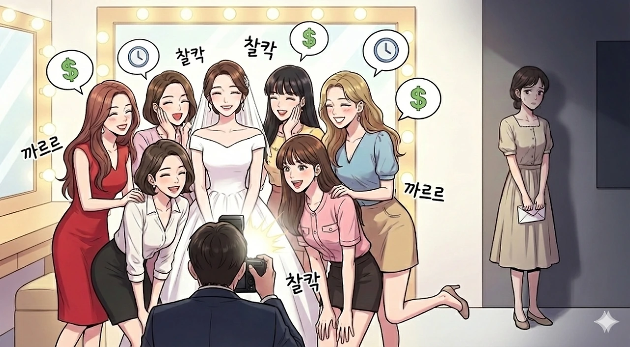 결혼식 앨범을 펼치면 그들은 영원히 신부의 절친으로 남아 있을 것이다. 하지만 세월이 흘러 진짜 힘든 일이 닥쳤을 때, 그 앨범 속의 가짜 친구들은 단 한 명도 곁에 없을 것이다. 그때 신부의 손을 잡아줄 사람은, 돈으로 사지 않은 그 한 명의 진짜 친구일 텐데 말이다.