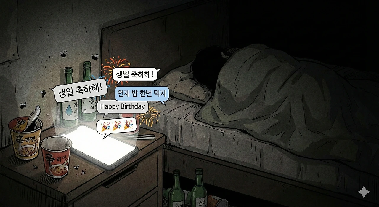 그들은 모른다. 자신들이 축하 메시지를 보내고 있는 그 친구가, 이미 한 달 전에 차가운 시신이 되었다는 것을. "밥 한번 먹자"던 그들이, 정작 그가 컵라면으로 끼니를 때우며 죽어갈 때는 어디에 있었는지.
