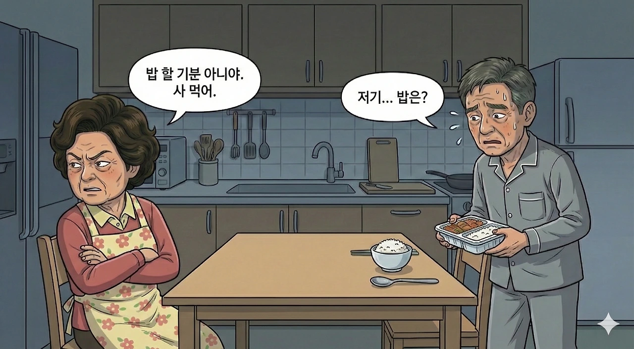 위기감을 느낀 나경제 씨가 슬그머니 말을 걸었다. "저기... 밥은?" 정 여사는 쳐다보지도 않고 말했다. "밥 할 기분 아니야. 사 먹어." 결국 그는 편의점 도시락을 사 들고 들어와야 했다. 1시간 만에 사과했으면 말 한마디로 끝났을 일이, 3일을 끄는 바람에 막대한 식비 지출과 자존심 붕괴를 겪었다.