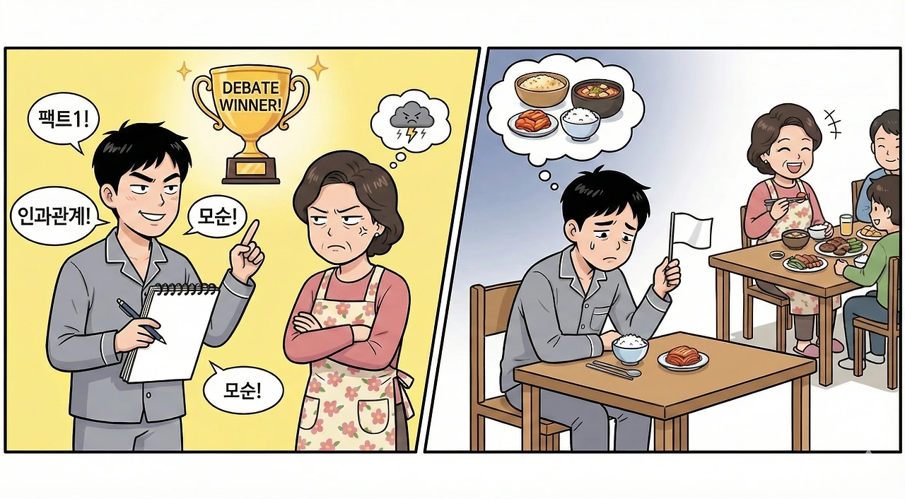 나경제 씨는 자신이 토론에서 승리했다고 믿었다. 의기양양했다. 하지만 그날 저녁, 밥상엔 찬밥 한 덩이와 김치뿐이었다. 그리고 일주일간 정 여사는 그에게 눈길조차 주지 않았다. 그는 논리에서 이겼지만, 관계에서 졌다. 아내의 마음을 잃고 얻은 승리가 무슨 소용인가. 그는 빈 밥솥을 긁으며 뼈저리게 후회했다.