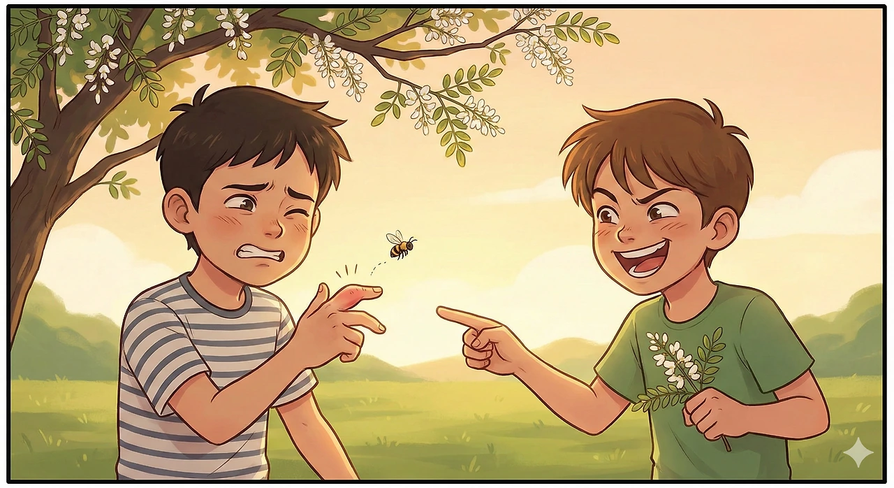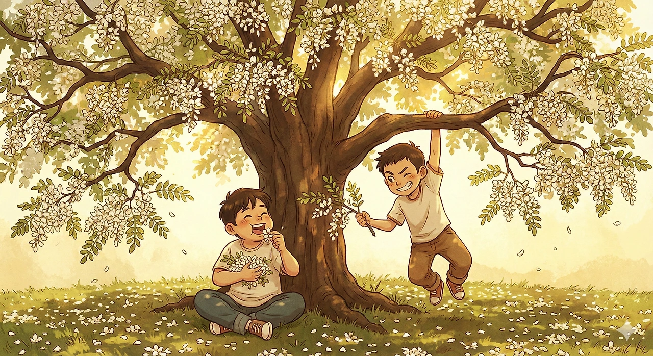 "야, 이거 잎파리로 가위바위보 할래?" 배가 좀 차면 우리는 아카시아 잎 줄기를 하나씩 뜯었다. 손가락으로 잎을 튕겨 떨어뜨리는 놀이. "이겼다! 딱밤 맞아라!" 숲속은 우리의 웃음소리와 '윙윙'거리는 벌 소리로 가득 찼다.