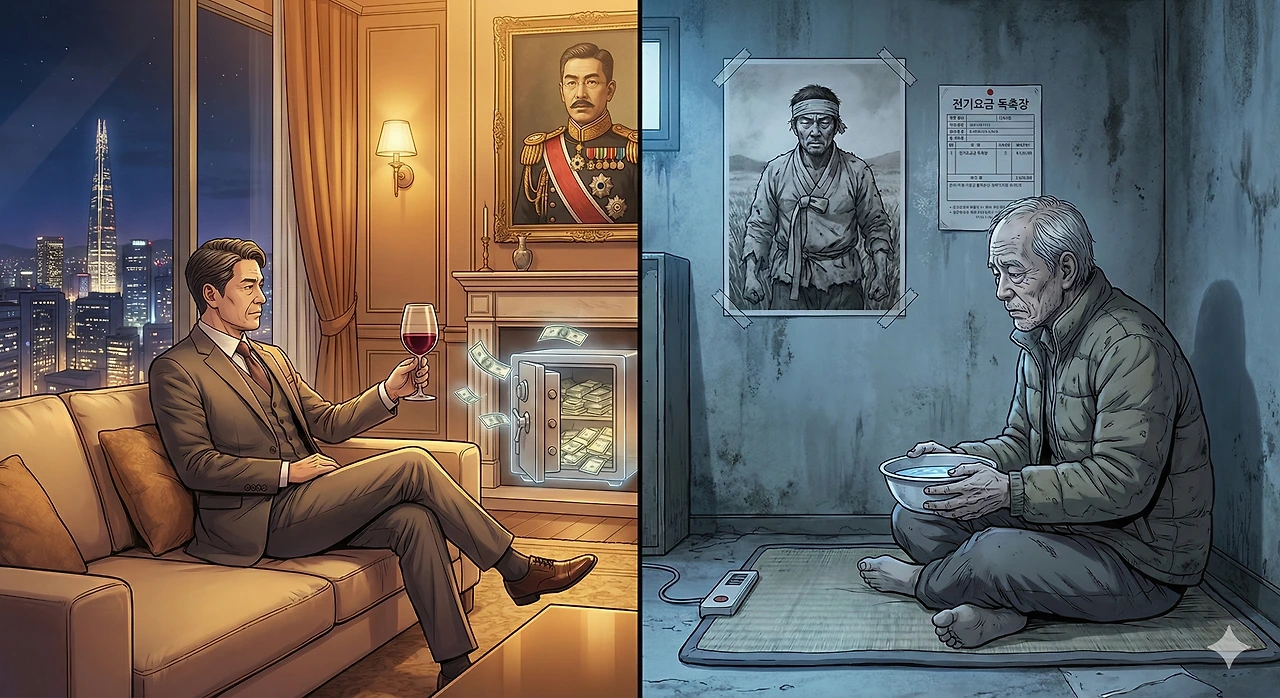 해방이 되었을 때, 역사는 그를 단죄하지 않았다. 오히려 그는 '반공 투사'로, '행정 전문가'로 신분 세탁을 하고 권력의 중심에 남았다. 그가 축적한 더러운 부(富)는 고스란히 자식에게 세습되었다. 그 돈으로 자식들은 최고의 교육을 받았고, 다시금 이 사회의 기득권이 되었다.
