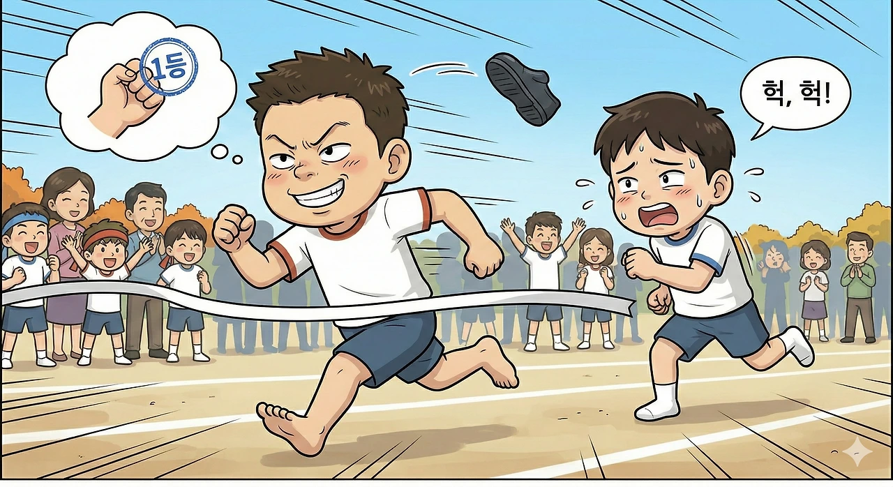 똥장군은 빨랐다. 녀석은 신고 있던 검정 고무신이 벗겨져 날아갔는데도, 맨발로 운동장을 질주했다. "와아아! 똥장군 잘한다!" 녀석은 압도적인 차이로 1등을 차지했다. 결승선 테이프를 끊고 나서야 녀석은 흙투성이가 된 발을 보며 헤헤 웃었다. 손등에 찍힌 1등 도장. 그 파란 도장 자국이 훈장보다 빛나 보였다.