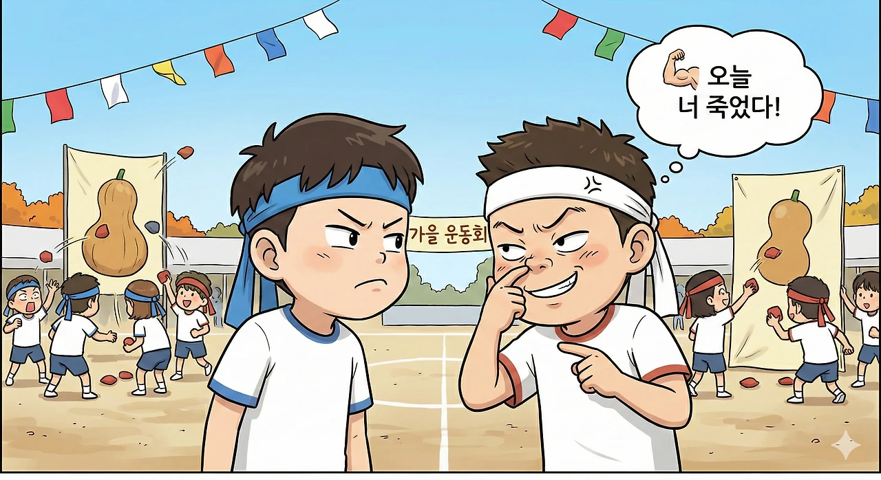 "아싸! 우리가 이겼다!" 똥장군이 펄쩍펄쩍 뛰며 나를 놀렸다. 나는 입을 삐죽거렸지만, 사실 승패는 중요하지 않았다. 내 머릿속은 온통 '점심시간' 생각뿐이었으니까.