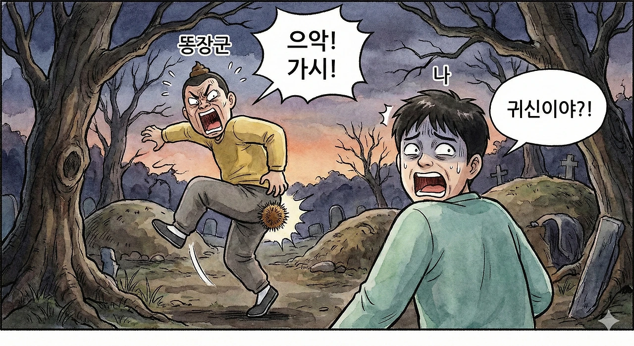 갑자기 똥장군이 비명을 지르며 주저앉았다. "왜 그래? 귀신이야?" 나도 놀라서 털썩 주저앉았다. 심장이 입 밖으로 튀어나올 것만 같았다.