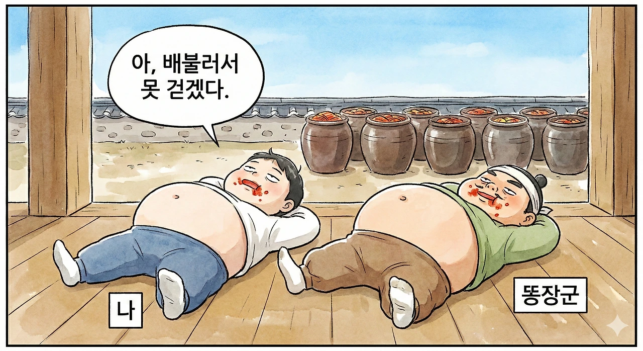 "아, 배불러서 못 걷겠다." 나와 똥장군은 배를 두드리며 마루에 벌러덩 누웠다. 하늘은 높고 파랬다. 코끝에는 여전히 매운 고춧가루 냄새가 남아 있었지만, 배 속 가득한 고기 냄새 덕분에 세상 그 무엇도 부럽지 않은 오후였다.