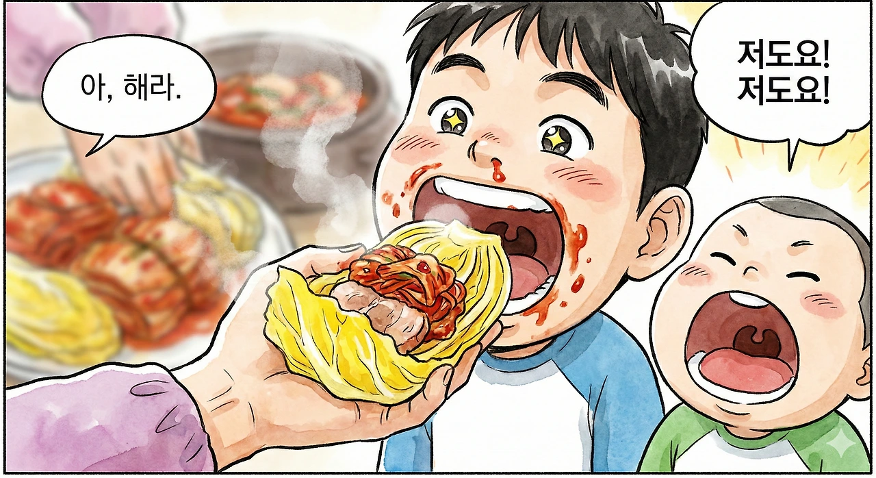 우리는 평상 귀퉁이에 제비 새끼처럼 입을 벌리고 앉았다. 할머니는 노란 배추 속잎(고갱이)을 하나 뜯어, 그 위에 돼지고기 한 점을 올리고 붉은 김치 속을 듬뿍 얹으셨다.
