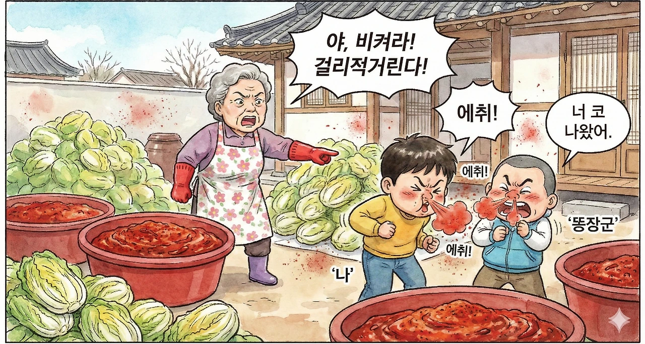 마당은 아수라장이었다. 할머니는 김장 총사령관이었다. 앞치마를 두르고 빨간 고무장갑을 낀 채, 고춧가루가 더 들어가네 마네, 젓갈이 짜네 싱겁네 하며 현장을 지휘하셨다. 둘째 숙모는 (버스 안내양 시절의 체력을 살려) 배추를 나르고 버무리느라 허리 펼 새가 없었고, 동네 아주머니들까지 품앗이로 와서 수다를 떨며 손을 놀렸다.