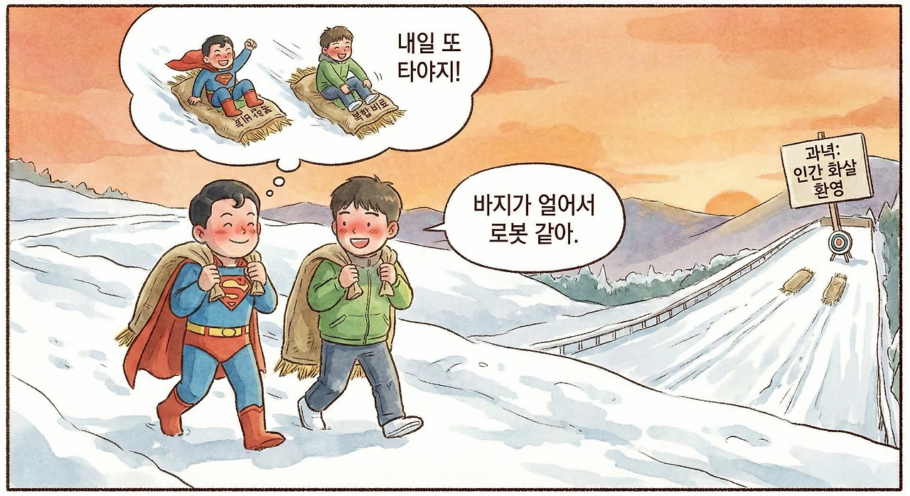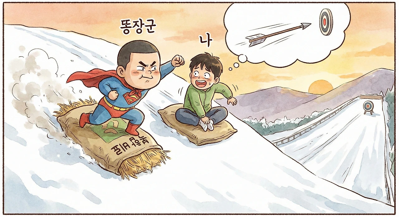 해가 질 때쯤, 우리는 새로운 기술을 개발했다. "야, 이번엔 기차다!" 똥장군이 앞장서고 내가 뒤에서 녀석의 허리춤을 잡았다. 2단 합체. 무게가 더해지니 속도는 두 배였다. 우리는 괴성을 지르며 눈 덮인 활터를 폭주 기관차처럼 질주했다.