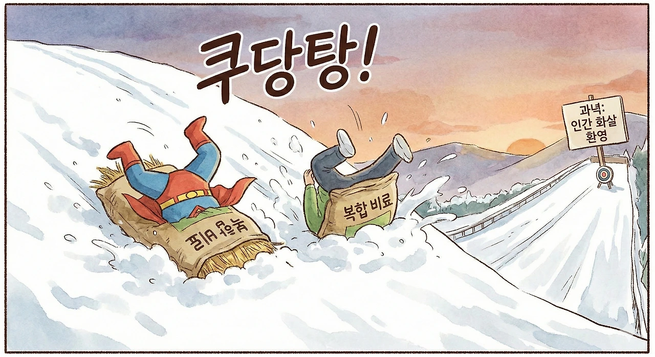 "푸하하! 야, 너 꼴 좀 봐라." 똥장군이 눈사람이 된 나를 일으켜 세웠다. 내 머리며 눈썹, 콧구멍까지 눈이 가득 차 있었다. "죽인다... 진짜 빠르지 않냐?" 심장이 터질 듯 쿵쾅거렸다. 1분도 안 되는 짧은 비행이었지만, 그 짜릿함은 말로 설명할 수 없었다.