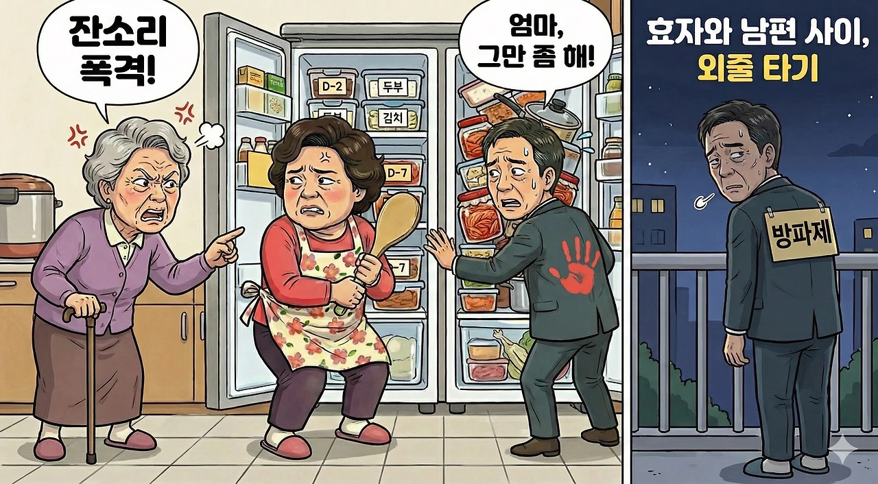 나경제 씨는 안다. 여기서 가만히 있으면 중간은 가지만, 아내의 마음은 영영 잃는다. 그는 식은땀을 흘리며 어머니 앞을 가로막는다. "엄마, 냉장고 내가 어제 뒤져서 그래. 이 사람 요즘 바빠. 그만 좀 해."