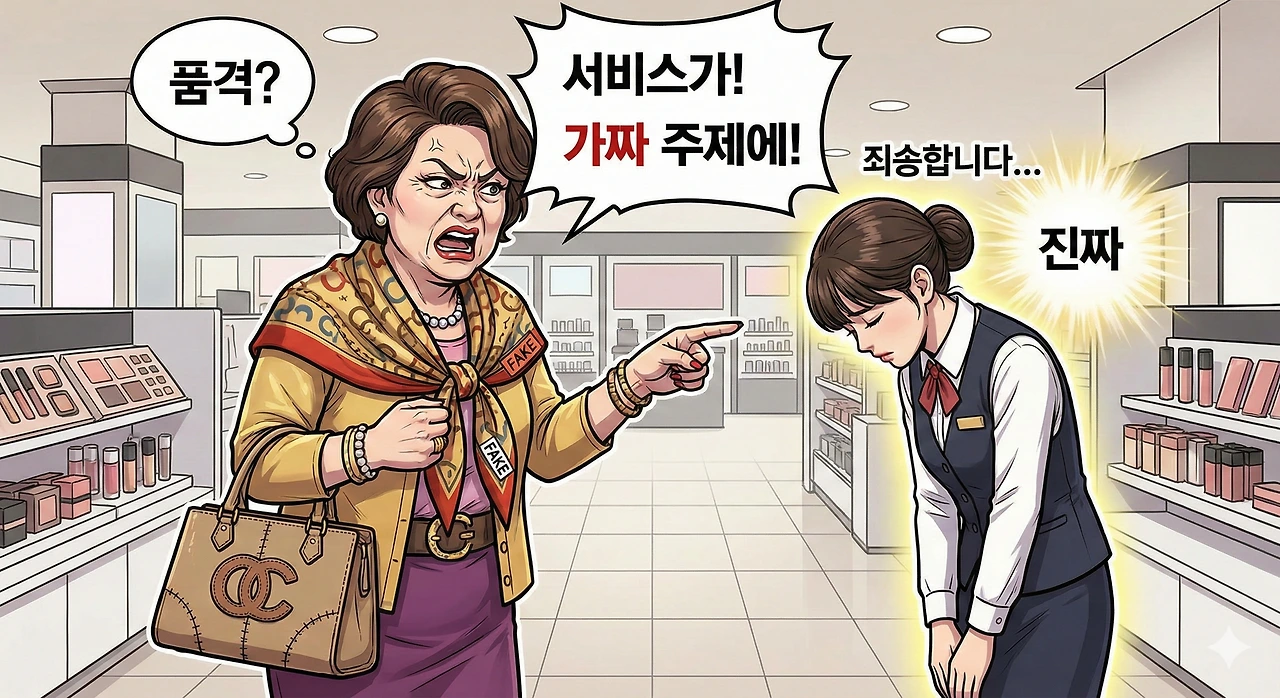 그녀는 지금 머리부터 발끝까지 '가짜'를 두르고서, 직원에게 '진짜 태도'를 요구하고 있었다. 짝퉁 가방을 든 손으로 책상을 치며 "너희들의 가짜 미소가 역겹다"고 소리치고 있는 것이다.