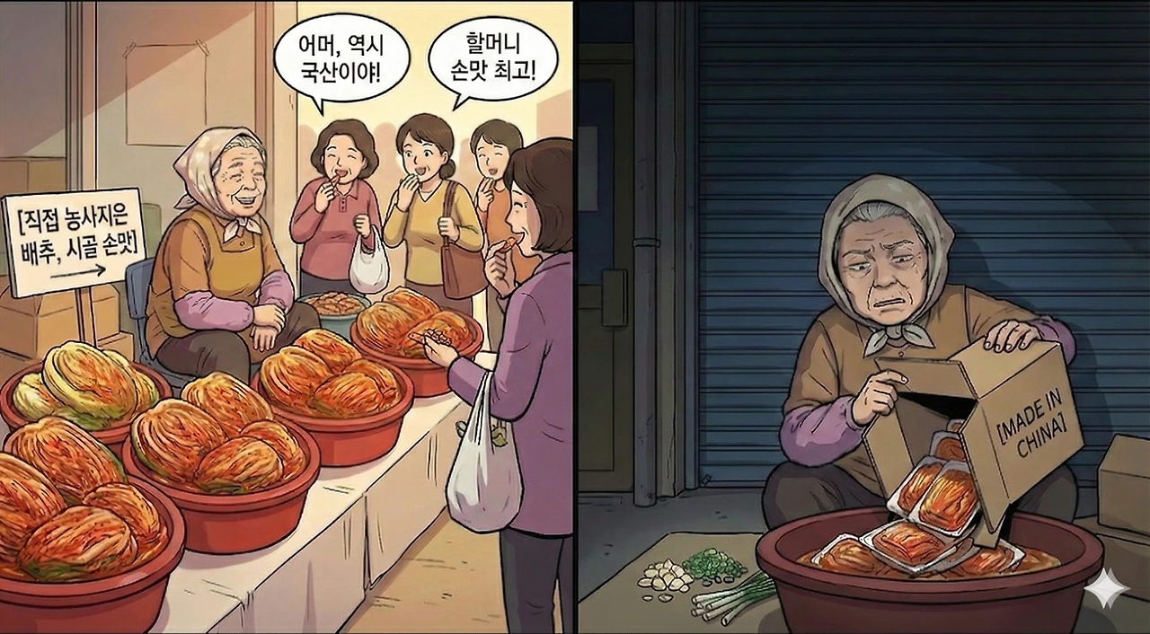 매콤하고 짭짤한 그 맛. 사람들은 그 투박함을 믿는다. "엄마 손맛이야"라며 지갑을 연다. 검은 비닐봉지에 담긴 김치는 묵직하다.