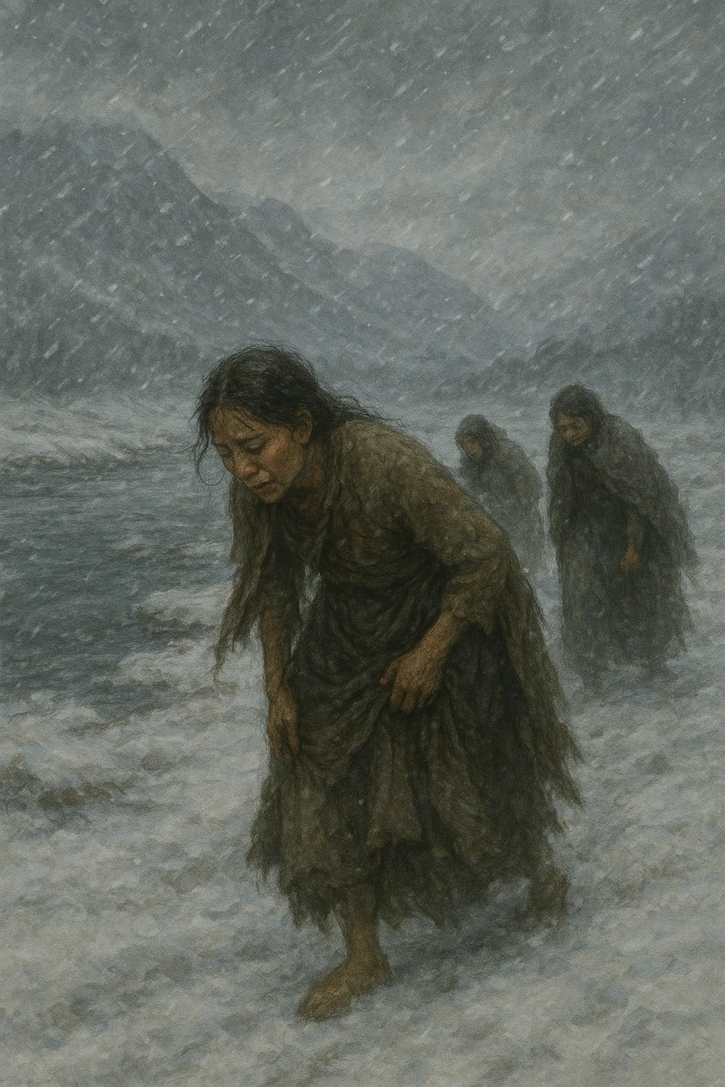눈보라 속 청 군사에 잡혀 끌려가는 여인들