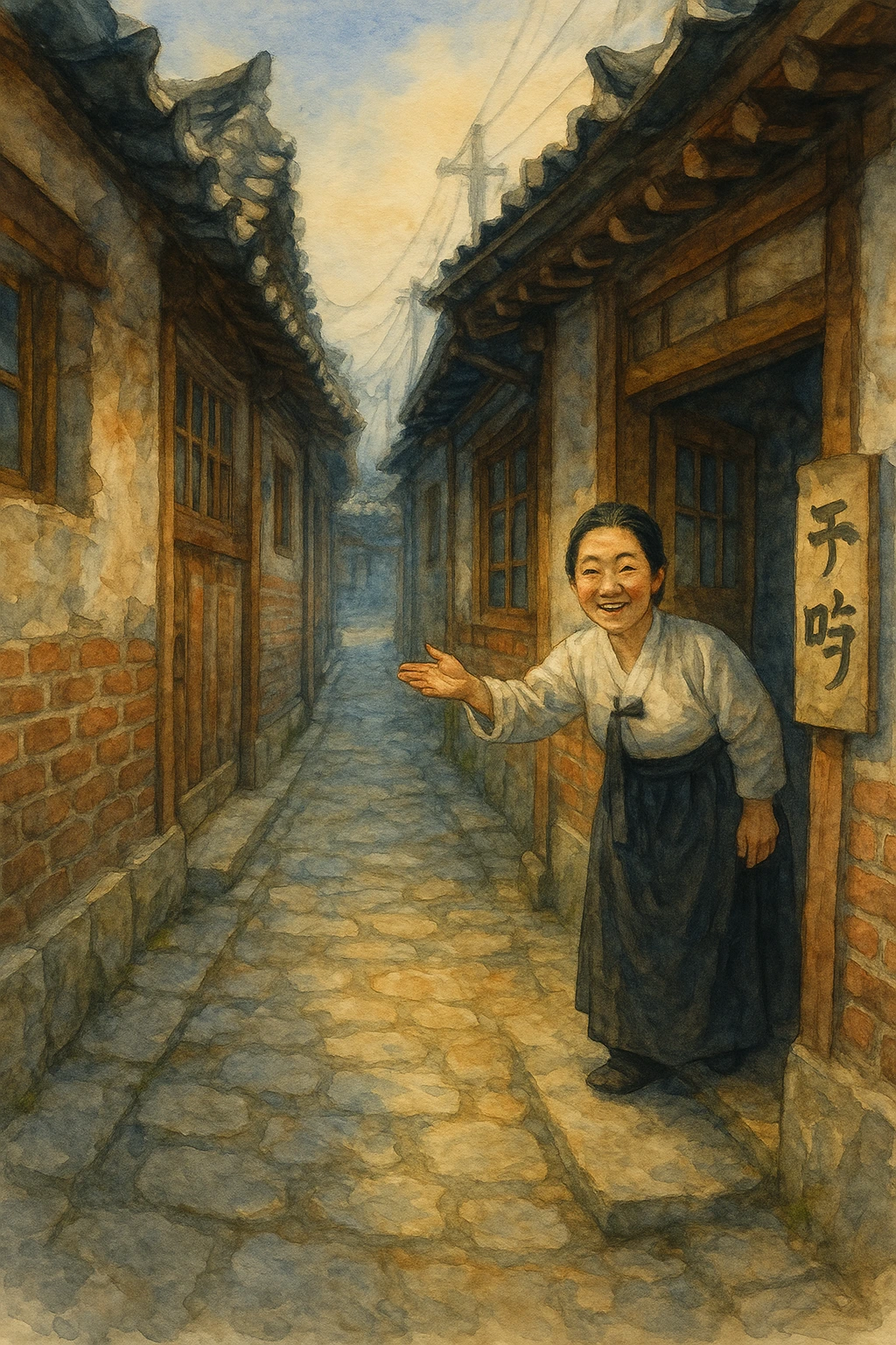 골목길 모퉁이에서 퉁탕하게 웃고 있는 선술집 주모.