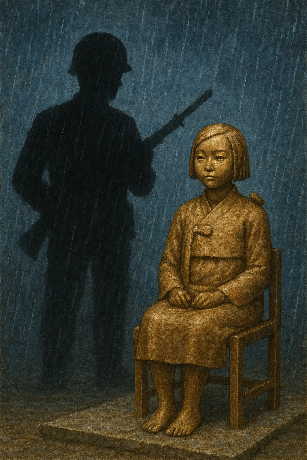 대청마루를 걸레질하다가 꽃잎을 보는 장면에서, ‘낙수되는 물방울’이 ‘눈물’로 변환됩니다. 여기서 비는 단순한 날씨 현상이 아니라, 피해자들의 눈물과, 시대가 흘려보낸 회한을 중첩시킵니다. 마지막 연에서 “우산도 없이 / 소녀상의 구겨진 치마폭에 고인 빗물”은 그 고통이 아직도 현재진행형임을 강하게 시각화합니다.