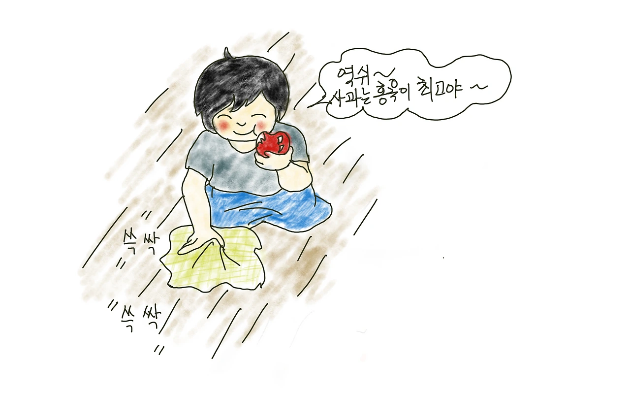 친구네 과수원에서 뛰놀다가 햇볕에 알맞게 달궈진 사과를 한 입 베어물 때의 감동이란! 사과나무 아래 늘어놓아 자연숙성시킨 사과의 맛은 냉장사과의 맛과는 비교조차 할 수 없을 만큼 환상적이었다. 모든 게 알맞았다. 알맞게 달큼하고, 알맞게 사각거렸고, 알맞게 과즙이 흘렀다. '가을날 태양의 미소'라고밖에 표현할 길이 없던 그 맛!