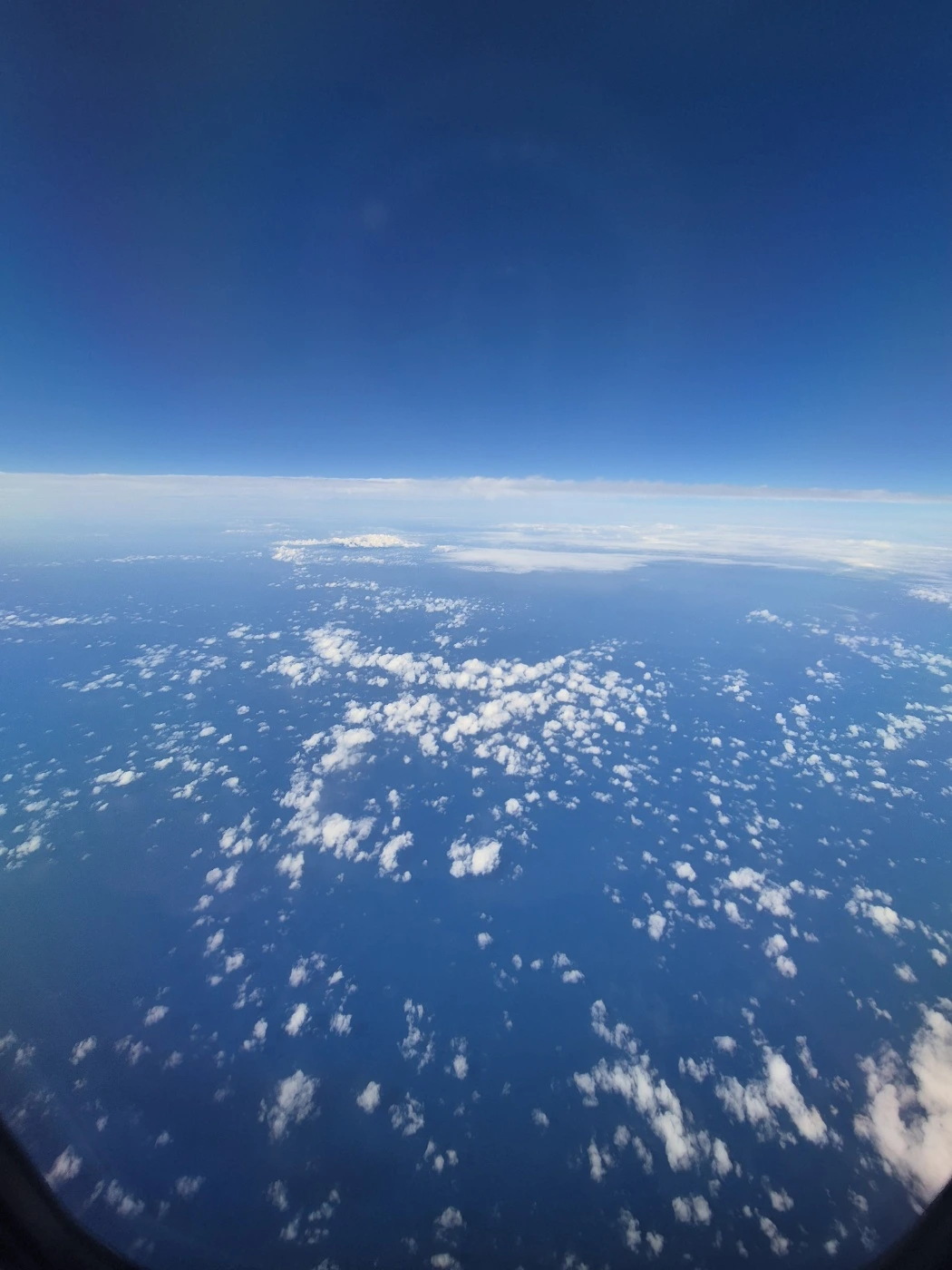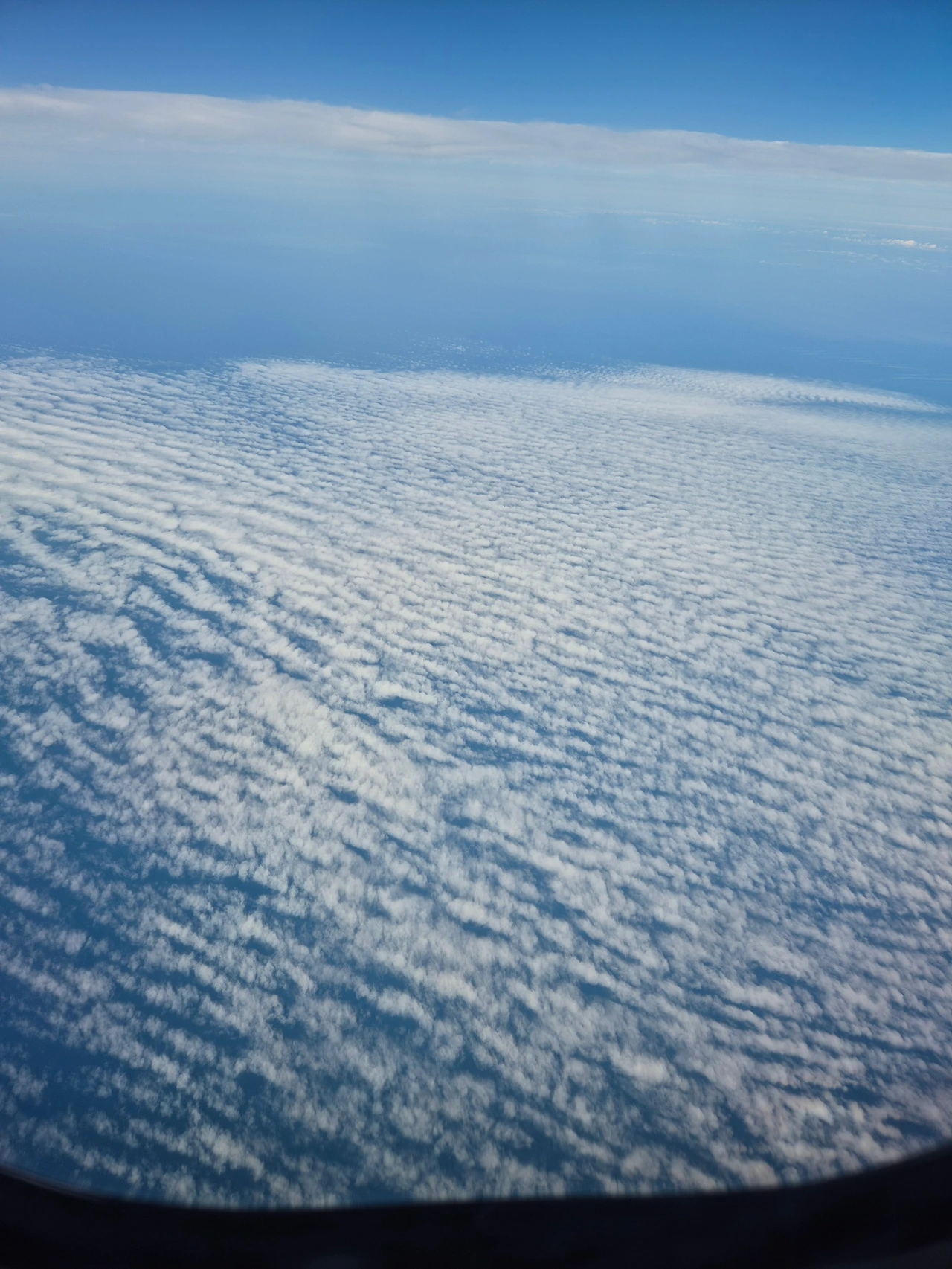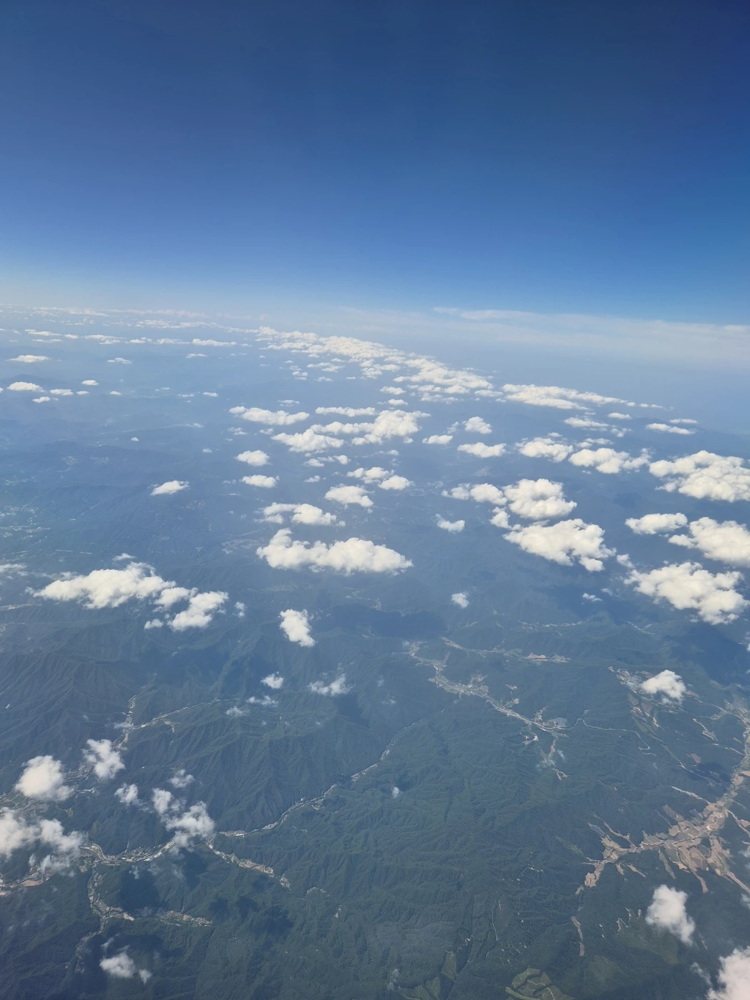 구름은 올려다볼 때도 멋지지만 내려다보아도 황홀하기만 하다. 낮은 고도의 구름층, 항공기 고도와 비슷한 높이의 구름층, 좀 더 높은 구름층을 겹겹 두른 채 창공은 표연히 나그네들을 잔뜩 태운 항공기를 응시한다. 폭신폭신한 저 구름밭에서 뛰놀고 싶다. 저 구름밭 어디쯤 그리운 엄마가 계실 것만 같다. 울 엄마도 여행 참 좋아하셨는데......
