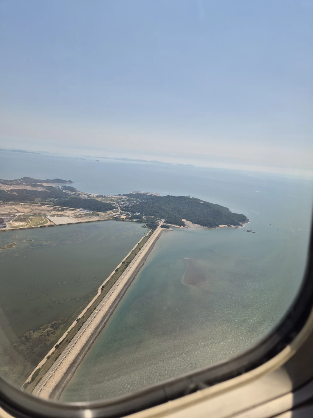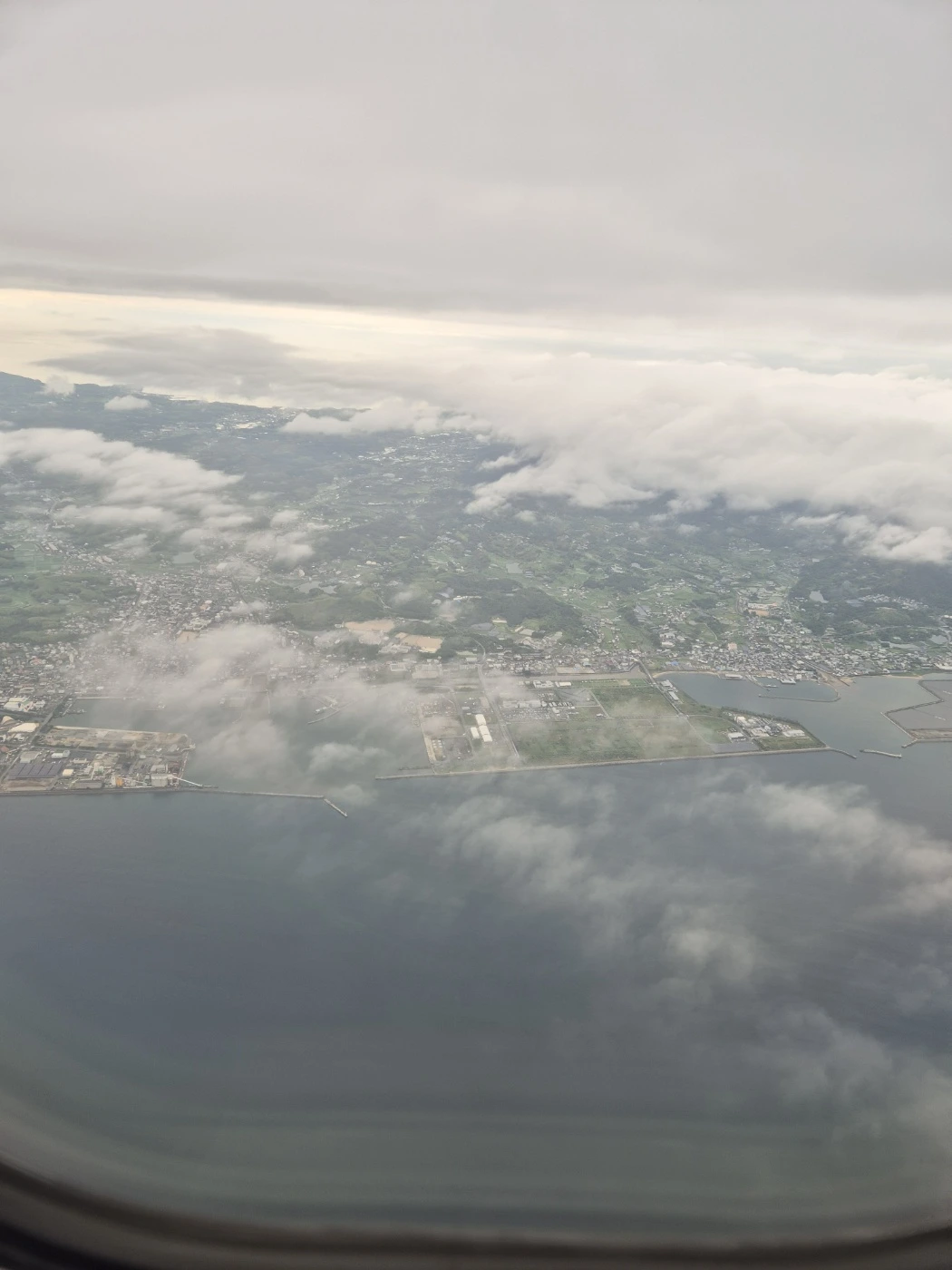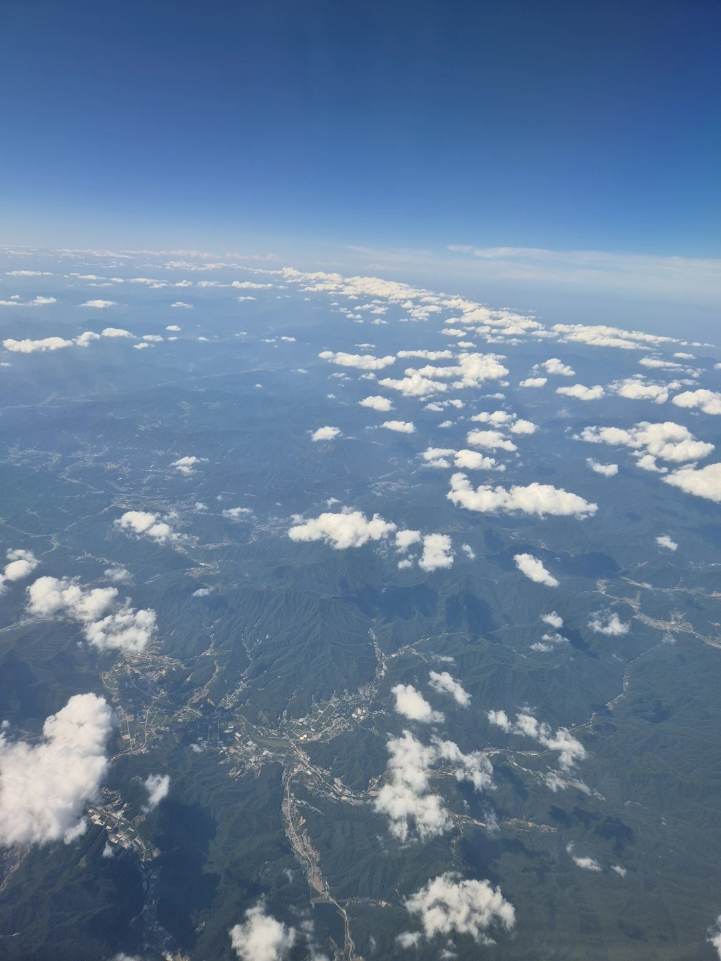 어느 순간, 먹장구름이 푸른 창공을 덮어버린다. 일본영공에 가까워졌나, 간사이 공항에 비가 내린다는데. 먹구름 사이로 육지가 보인다. 일본의 어느 항구인가 본데 되게 넓다. 촘촘히 박혀 있는 나지막한 건물 저 너머로 병풍 같은 산맥이 보인다. 고베항인가.